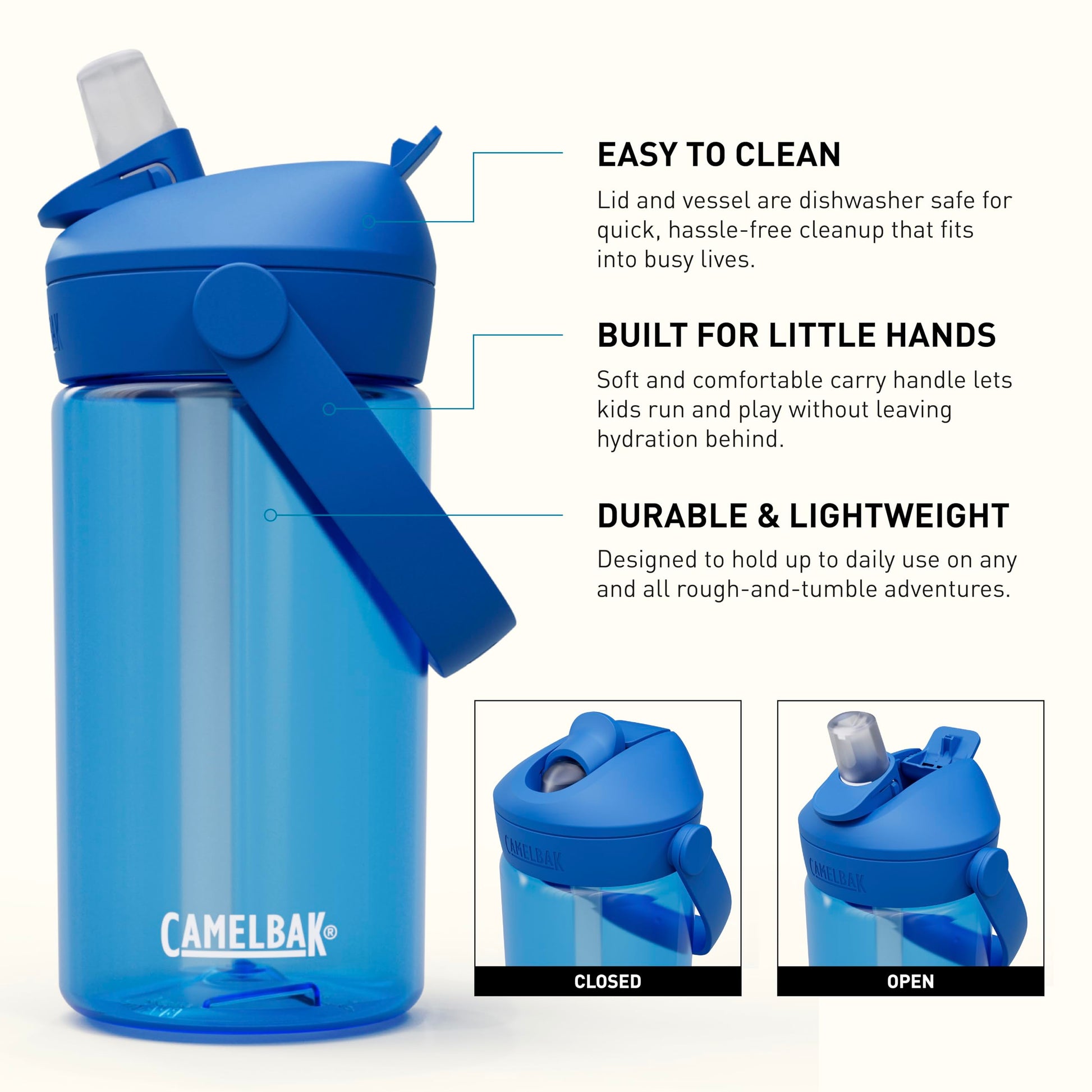 CamelBak Thrive Flip Straw Kids Bite Valve Tritan Renew Water Bottle True Blue, 14oz